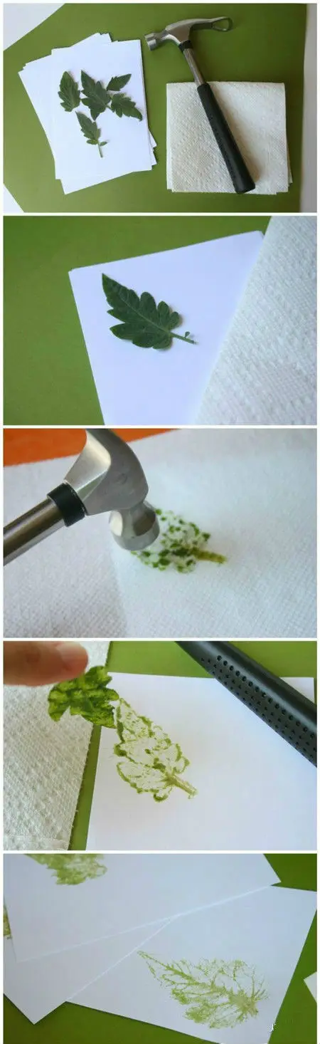 在两张纸之间,放上树叶,用锤头敲击树叶,将叶绿素和水分印在纸上,便得出了漂亮的树叶脉