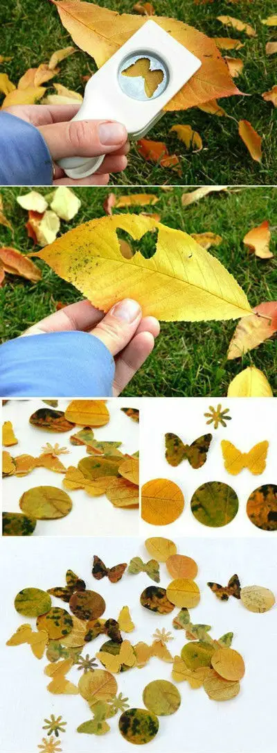 使用各种不同形状的打孔器,创造出不同形状的落叶标签。