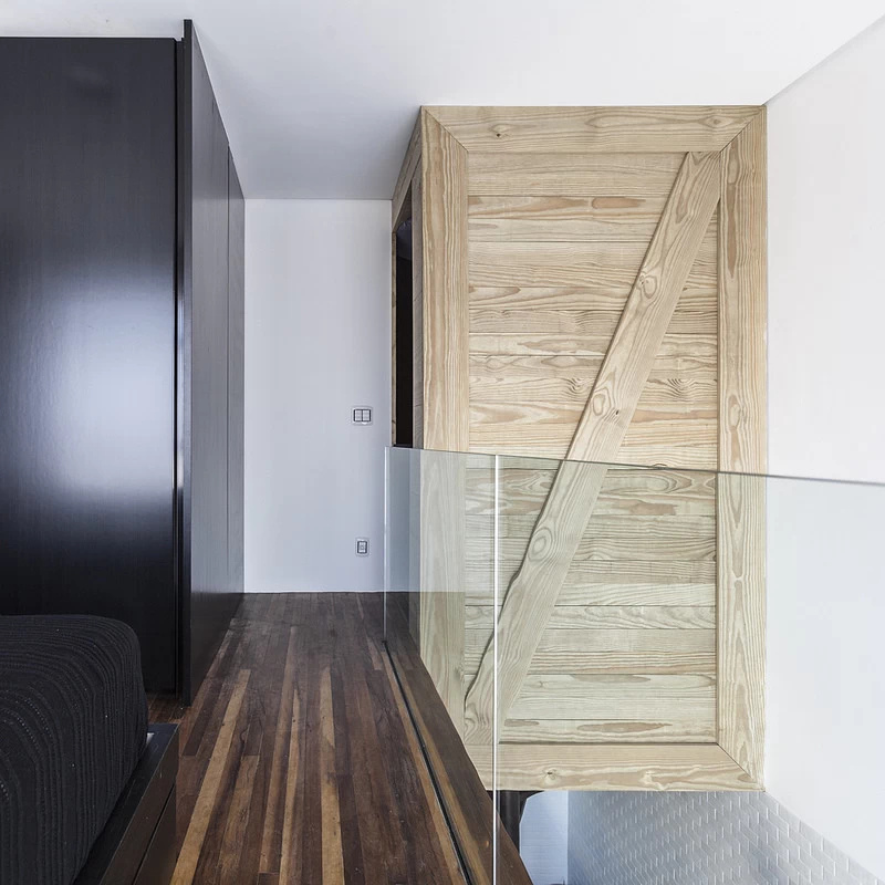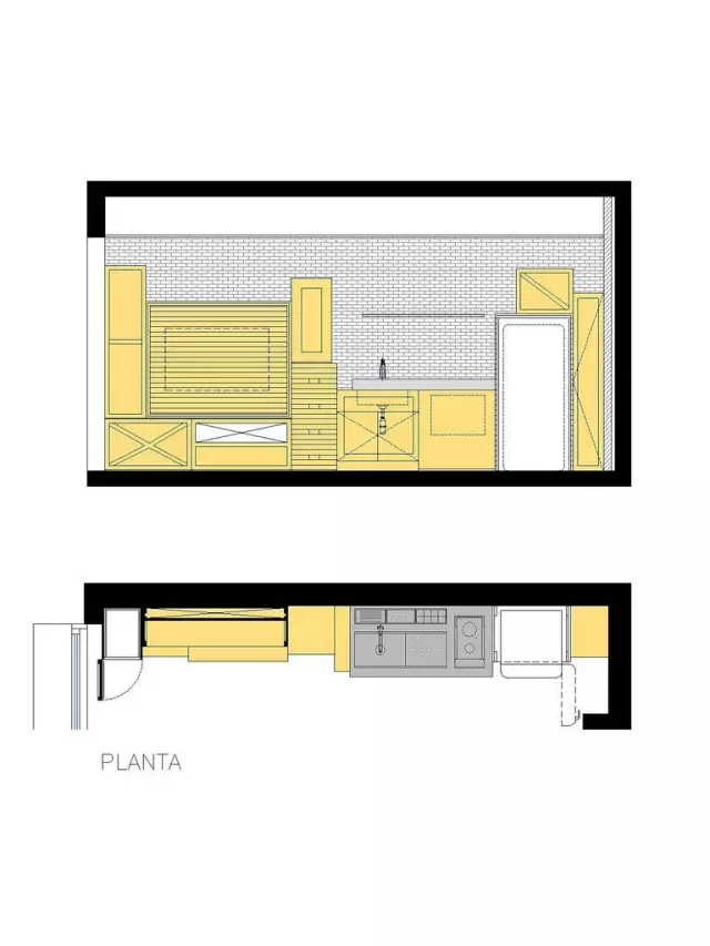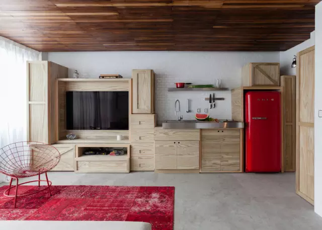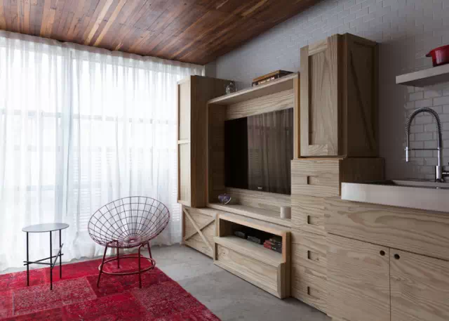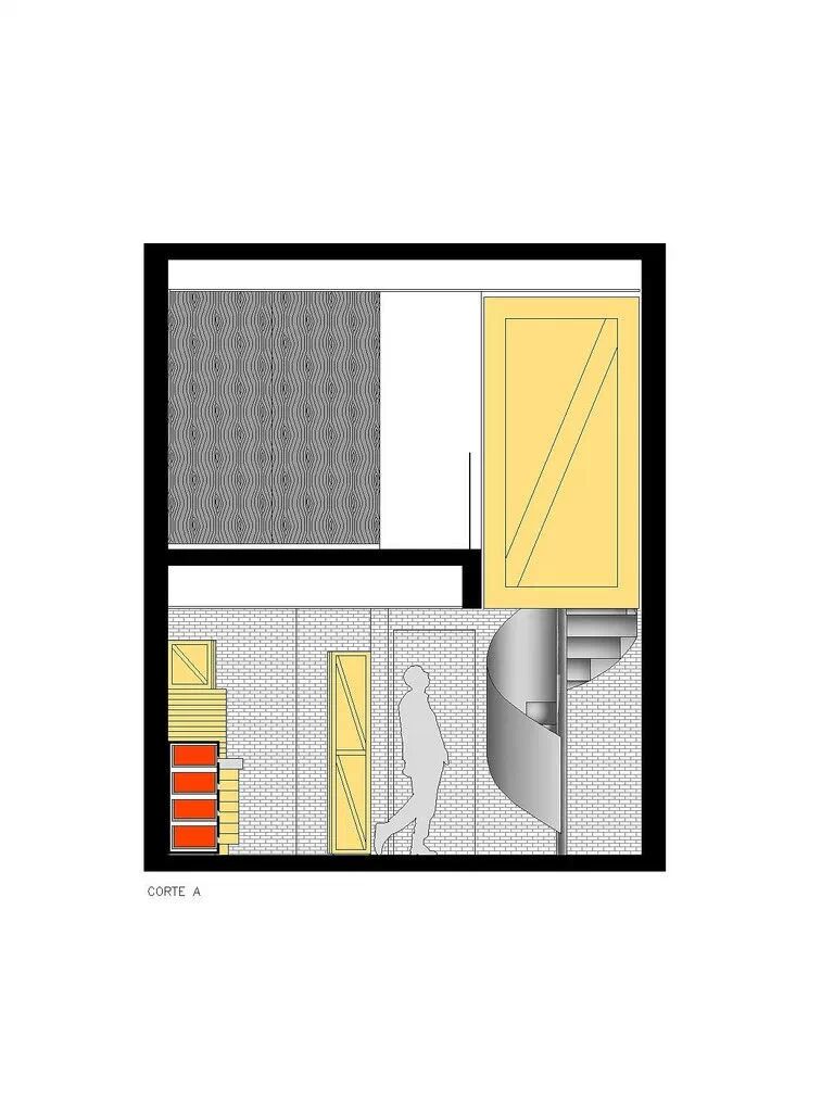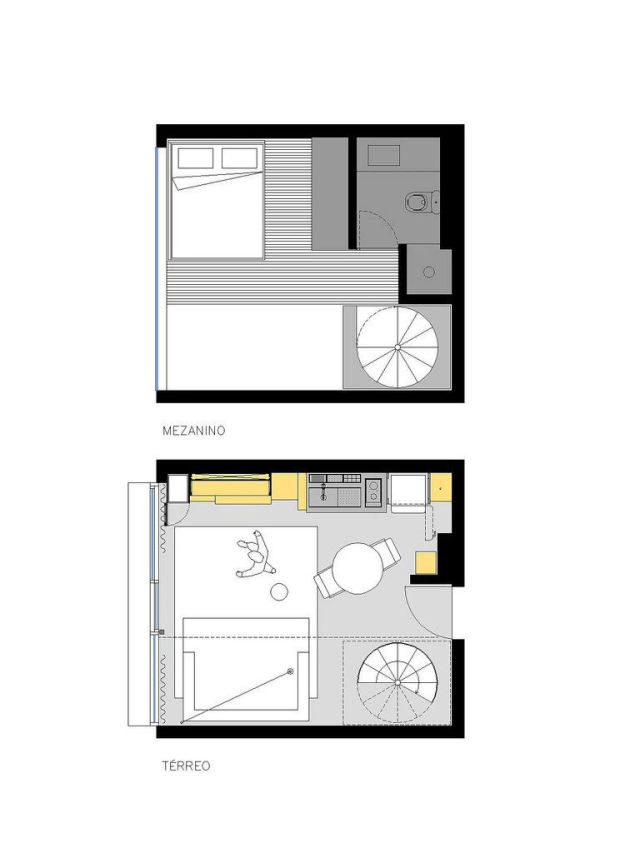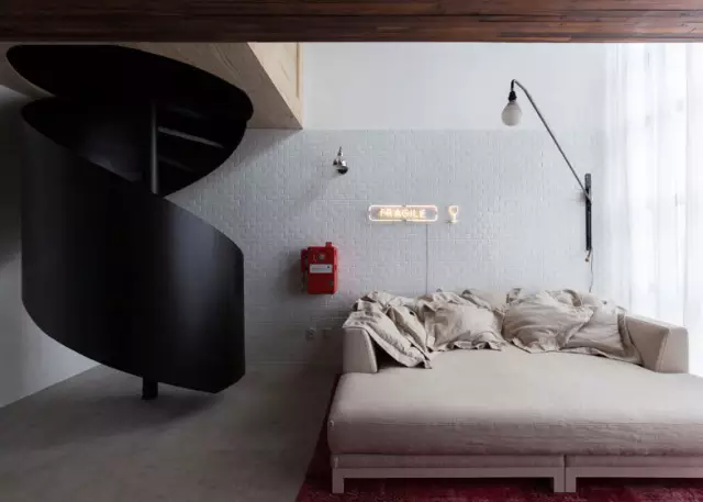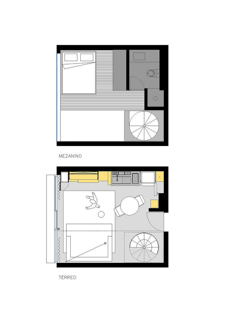 位于巴西圣保罗的这幢36㎡小公寓由建筑设计师Alan Chu设计完成,公寓分上下两层,圆形旋转楼梯相连。楼下是客厅、餐厅和厨房,由于面积局限没有墙体分割,一排箱子元素堆砌的柜子作为电视柜、橱柜和储藏柜。客厅沙发则是最为实用的沙发床,有客人的时候也可以作为卧室实用。走上旋转楼梯,二楼是卧室和一个卫生间。